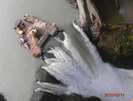 Work on the Elwha River dam removal is over for the year because the “fish window” begins November 1, 2012. There are only 65 vertical feet of the Glines Canyon Dam left, and it is now low enough to drain the remaining pool of Lake Mills. Scientists are now seeing coarser sediments coursing downstream from Glines Canyon dam, adding sand and gravel movement to the silt and clay already being transported by the river. New sand deposits can now be seen in the river’s middle ‘reach’, the section between Glines Canyon and the old Elwha Dam site.